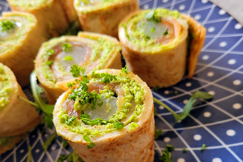 Een exclusief lentehapje, bijgerechtje, borrelhapje, onderdeel van een feestelijk (brunch)buffet of de eerste lente-picknick. Gezellig om met de (klein)kinderen de pannenkoeken te bakken.